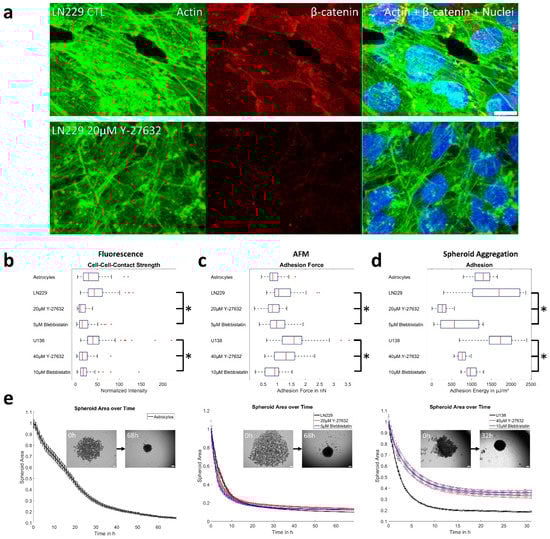 (a) Representative examples of actin and β-catenin staining for LN229 cells. Scale bar depicts 10 µm. (b) Cell–cell adhesion strength as estimated by the fluorescence images. For all statistically significant differences: p < 0.0001. For astrocytes 73 cell–cell connections were measured. For LN229 70, 49 or 72 and for U138 75, 74 or 67 cell–cell junctions were analyzed for control conditions or when treated with Y-27632 or blebbistatin, respectively. (c) Cell–cell adhesion forces as measured using AFM. For LN229 treated with Y-27632 and U138 treated with blebbistatin p < 0.01, p < 0.05 otherwise. The sample size for astrocytes was 30, for LN229 39, 35, 34 and for U138 32, 27, 26 for control conditions or after treatment with Y-27632 or blebbistatin, respectively. (d) Values calculated for the cell–cell-adhesion energies obtained from the spheroid aggregation. p < 0.0001 for all significantly different treatments, as assessed by one way ANOVA with Tukey post hoc test. For astrocytes 46 spheroids were assessed. For LN229 31, 23 or 17 and for U138 cells 33, 39 or 27 spheroids were measured for control conditions or Y-27632 or blebbistatin treatment, respectively. (e) Evolution of the spheroid area over time for astrocytes and both GBM cell lines for all used conditions. Inlets show typical spheroids at the beginning and end of the measurement. Sample size is identical to d. Scale bars depict 300 µm. (b–d) Box plots show the median (red line), 25 and 75 percentile (box), non-outlier range (whiskers) and outliers (red dots). (e) Error bars depict the standard error of the mean. Stars (*) depict statistically significant results.