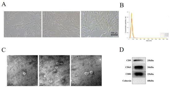Figure 1. Identification of human umbilical cord MSCs (hUC-MSCs) and MSC-derived extracellular vesicles (MSC-EVs). (A) Light microscope image of hUC-MSCs (20×). (B) Diameters and concentration of MSC-EVs were detected by nanoparticle trafficking analysis. (C) Identification of MSC-EVs by transmission electron micrograph. (D) Western blot showed the protein level of MSC-EVs CD9, CD63, CD81, and Calnexin.