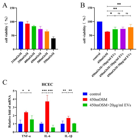 Figure 2. MSC-EVs showed a protective effect on HCECs under hyperosmotic stress. (A) Cell viability of HCECs exposed to hyperosmotic medium for 12 h. (B) Cell viability of HCECs exposed to hyperosmotic medium and treated with MSC-EVs for 12 h. (C) HCECs were incubated in hyperosmotic medium and treated with MSC-EVs for 3 h. The mRNA expression of TNF-α, IL-1β and IL-6 was quantified using RT-PCR. Three independent experiments were pooled. Data are presented as mean ± SD of three independent experiments. (ns: not significant, * p < 0.05, ** p < 0.01, *** p < 0.001).