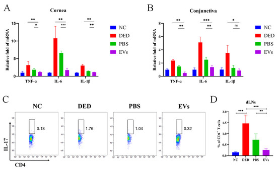 To further investigate whether MSC-EVs can suppress the inflammation in DED, we assessed the mRNA expression levels of inflammatory cytokines in cornea and conjunctiva and the frequency of Th17 cells in dLNs. The RT-PCR results revealed that, compared to the PBS-treated group, MSC-EVs-treated mice had reduced mRNA expression levels of TNF-α (pcornea = 0.0137, pconjunctiva = 0.001), IL-6 (pcornea < 0.0001, pconjunctiva = 0.006), and IL-1β (pcornea = 0.0042, pconjunctiva = 0.2023) in both the conjunctiva and the corneas. More significant differences were observed between MSC-EVs-treated mice and DED mice in the mRNA expression levels of TNF-α (pcornea = 0.0088, pconjunctiva = 0.0002), IL-6 (pcornea = 0.0027, pconjunctiva = 0.0001), and IL-1β (pcornea = 0.001, pconjunctiva = 0.0155) (Figure 4A,B). Flow cytometry data showed that 14 days of DED induction upregulated the frequency of Th17 cells in dLNs compared to NC mice (1.473 ± 0.379 vs. 0.154 ± 0.026 p < 0.0001). Topical application of PBS and MSC-EVs reduced the frequency of Th17 cells in dLNs, with MSC-EVs demonstrating more significant effects than PBS (EVs = 0.2633 ± 0.74, PBS = 0.726 ± 0.2699, pDED VS. EVs < 0.0001, pPBS VS. EVs = 0.0028) (Figure 4C,D).