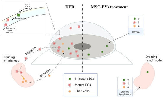 The cornea was endowed with various kinds of antigen presenting cells (APCs), the density of which increases from the center to the limbus [7]. Dendritic cells (DCs) are considered an important kind of APCs in DED immune response, playing a critical role in both innate and adaptive immunity [8]. Under basal conditions, DCs are able to induce and maintain immune tolerance. These DCs are immature DCs, which express less major histocompatibility complex class II (MHC-II) and co-stimulator B7 (CD80 and CD86) [9,10], and are essential for preventing immune damage to healthy tissue [11]. However, immune homeostasis on the ocular surface can be disrupted when tear film instability and tear hyperosmolarity occur [12]. TNF-α, IL-6 and IL-1β produced by epithelial cells promote DCs maturation and upregulate the expression of MHC-II, CD80 and CD86 on DCs [13]. Mature DCs migrate to the draining lymph nodes (dLNs) to initiate adaptive immune response during DED, promoting T cell polarization into Th17 and Th1 [14,15]. Effector T cells then migrate to the cornea and conjunctiva and secrete IFN-γ, IL-17, and other inflammatory cytokines, further aggravating ocular surface damage [16,17]. Thus, as key cells in DED immune response, inhibition of DCs function has a therapeutic effect on DED [18].