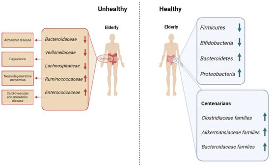 In general, differences in the composition of the gut microbiota have been reported between older and younger adults; Actinobacteria, particularly Bifidobacterium and Firmicutes, appear to decline with age, whereas Bacteroidetes and Proteobacteria, particularly Enterobacteriaceae and Clostridia, appear to increase.