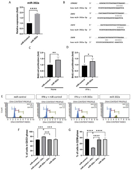 Effect of miR-302a on cell proliferation. (A) Expression of miR-302a was elevated. (B) Predicted miR-302a–binding sites in the 3′-UTR of the IFNGR2, IRF2, IRF6, and IRF8 mRNA indicate the interaction between hsa-miR-302a and IFN-γ signaling pathway. Perfect matches in seed regions are indicated by lines. miRNA targets were predicted using miRBase and TargetscanHuman 8.0. (C,D) BrdU incorporation assay was performed in miR-control and miR-302a with or without interferon-γ (IFN-γ). (E) Cell cycle analysis was performed, and cell cycle graph was shown. (F,G) IFN-γ induced the cell cycle arrest, which was eliminated by miR-302a. * p < 0.05, ** p < 0.01, *** p < 0.001 and **** p < 0.0001.