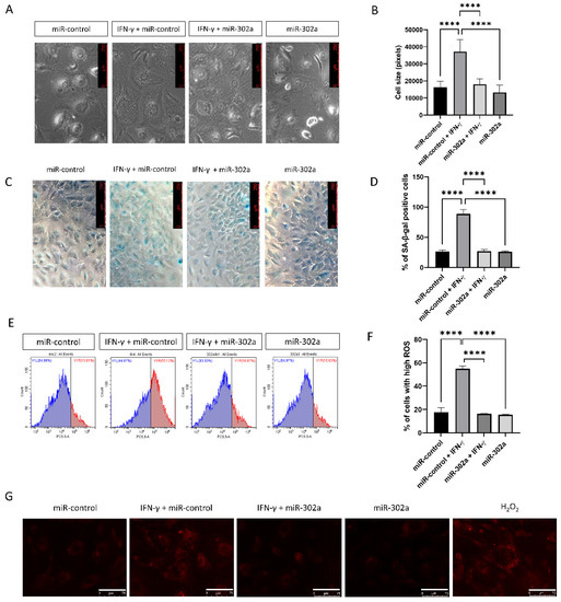 Effect of miR-302a on senescence. (A,B) Cell size was evaluated in miR-control and miR-302a with or without interferon-γ (IFN-γ). Scale bar = 250 µm. (C,D) Senescence-β-galactosidase staining was performed and blue staining indicated the senescence-β-galactosidase staining positivity. (E–G) Mitochondrial oxidative stress levels were measured using MitoSOX probe. Scale bar = 75 µm. Data presented as mean ± S.D. **** p < 0.0001.
