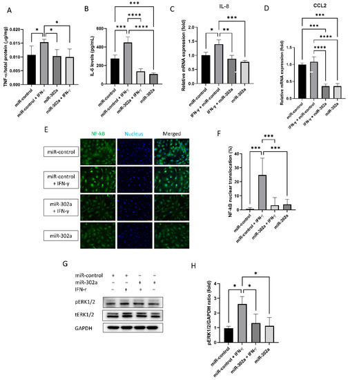 Effect of miR-302a on senescence-associated response. Senescence-associated secretary phenotype secretion (A,B) was measured in conditioned medium. (C,D) mRNA expression of IL-8 and CCL2 was evaluated by real-time PCR. (E,F) Nuclear factor-κB (NF-κB) translocation was evaluated using immunofluorescence staining. Scale bar = 75 µm. (G,H) Activation of extracellular-signal-regulated kinase (ERK) 1/2 was evaluated with or without IFN-γ or miR-302a. Data presented as mean ± S.D. * p < 0.05, ** p < 0.01, *** p < 0.001 and **** p < 0.0001.