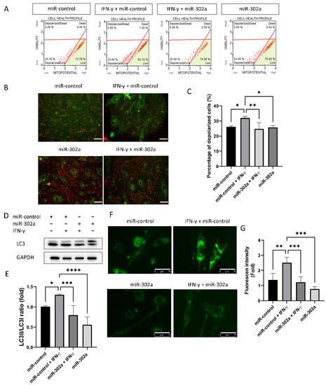 Effect of miR-302a on IFN-γ-induced cell death. (A–C) Mitochondrial membrane potential was measured by cell analyzer using Mitopotential kit, and by fluorescence imaging using JC-1 with or without IFN-γ or miR-302a. Scale bar = 75 µm. (D,E) Autophagy was measured by the conversion of LC3I to LC3II. (F) Autophagosome was stained using autophagy detection kit. Scale bar = 75 µm. (G) Fluorescence intensity of autophagosome was measured using autophagy detection kit. Data presented as mean ± S.D. * p < 0.05, ** p < 0.01, *** p < 0.001 and **** p < 0.0001.