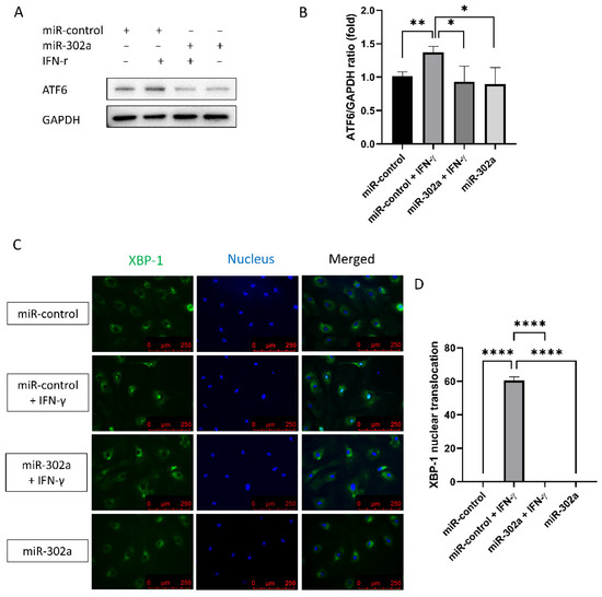 To assess ER stress levels, Western analysis of ATF6 levels and immunofluorescence staining of XBP-1 were performed. ATF6 levels, which are a sensor of ER stress, were elevated by IFN-γ treatment, which was eliminated by miR-302a (Figure 5A,B). Nuclear translocation of XBP-1, which indicates the activation of ER stress, was amplified by IFN-γ treatment, which was eliminated by miR-302a (Figure 5C,D).