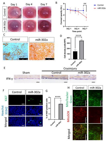 In vivo transfection of miR-302a and evaluation of corneal endothelium in rat. (A,B) Corneal opacity was evaluated in control and miR-302a group on day 7. (C,D) Alizarin S red staining showing corneal endothelium in control and miR-302a group on day 7. (E) Immunohistochemistry of IFN-γ was performed on the rat corneal endothelium. Scale bar = 25 µm. (F,G) Immunofluorescence staining of Ki67 was performed in corneal endothelium of rats. Scale bar = 25 µm. (H) MitoTracker green and MitoSOX staining was performed in corneal endothelium of rats in control and miR-302a group. Scale bar = 100 µm. Data presented as mean ± S.D. ** p < 0.01 and **** p < 0.0001.
