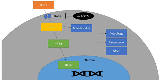 Schematic diagram of the effect of miR-302a on IFN-γ signaling pathway. This miRNA targets IFNGR2 and inhibits IFN-γ signaling pathway.