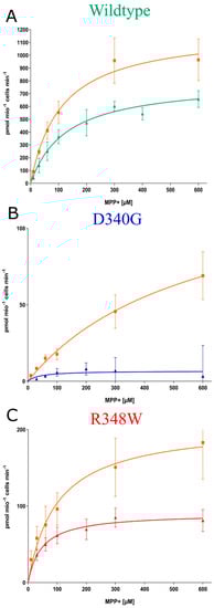 - Koleske, M.L.; McInnes, G.; Brown, J.E.H.; Thomas, N.; Hutchinson, K.; Chin, M.Y.; Koehl, A.; Arkin, M.R.; Schlessinger, A.; Gallagher, R.C.; et al. Functional genomics of OCTN2 variants informs protein-specific variant effect predictor for Carnitine Transporter Deficiency. Proc. Natl. Acad. Sci. USA 2022, 119, e2210247119. [Google Scholar] [CrossRef] [PubMed]