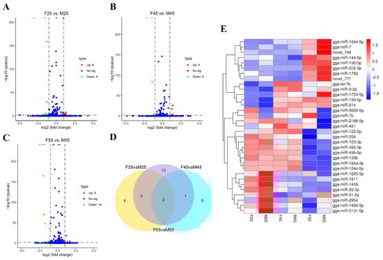 The differentially expressed miRNAs in chicken embryos and gonads. (A–C) Volcano plot of differentially expressed miRNAs in E2.5, E4.5, and E5.5 samples, respectively. The log2 (fold change) difference between females and males is shown on the X-axis, and the negative log of q values is shown on the Y-axis. Each point shows a gene with detectable expression in both samples. (D) Venn diagram of differentially expressed miRNAs. (E) Heat map visualization of the clusters of differentially expressed miRNAs between all samples. Values plotted are log2 fold change.
