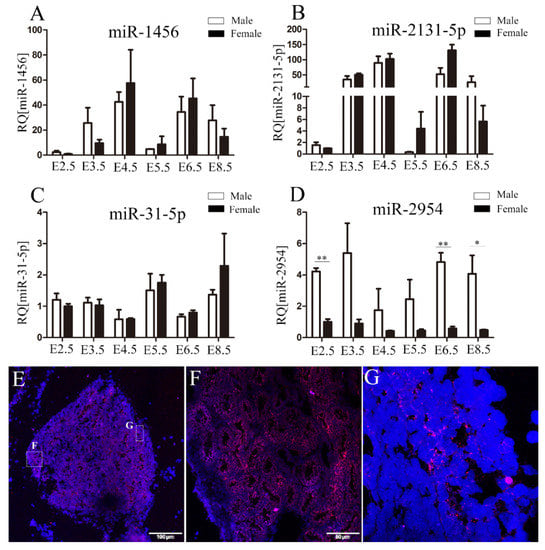 Validation of the expression profiles of miRNAs in chicken embryonic gonads. (A–D) The expression profiles of miR-1456, miR-2131-5p, miR-31-5p, and miR-2954 during E2.5–8.5, respectively. Each bar represents the mean and standard error of expression measured by qRT-PCR. Asterisks indicate statistical significance, * p < 0.05, ** p < 0.01. (E–G) The localization of miR-2954 expression in chicken embryonic testis at E10. DAPI staining of nuclei is blue and immunofluorescence of miR-2954 is red. E, scale bar = 100 μm; F, scale bar = 50 μm, thickness = 10 μm; G, magnification = 100.