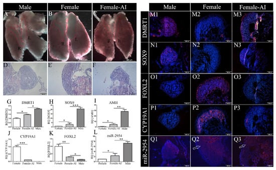 The morphology and gene expression in gonads at E10 chicken after AI treatment. (A–C) Gonads on top of the mesonephros in male, female, and AI-treated female chicken, respectively. (R) indicates right gonad, (L) indicates left gonad. (D–F) HE staining of gonads in male, female, and AI-treated female, respectively. In all HE staining images, the left gonad was selected. Scale bar as is shown in pictures, thickness = 6 μm. (G–L) Q-PCR expression of DMRT1, SOX9, AMH, CYP19A1, FOXL2, and miR-2954, respectively. Error bars show standard error of the mean (SEM) from at least three biological replicates in each group. Asterisks indicate statistical significance, * p < 0.05, ** p < 0.01, *** p < 0.0001. (M1–M3,N1–N3,O1–O3,P1–P3) Immunofluorescence results of DMRT1, SOX9, FOXL2, and CYP19A1 in control and AI-treated gonads. (Q1–Q3) In situ hybridization of miR-2954 in male, female, and AI-treated female. Blue fluorescence shows DAPI, which marks the nucleus; red fluorescence indicates expression of sex markers or miR-2954. Scale bar = 200 μm, thickness = 10 μm.