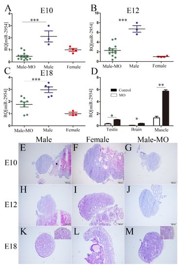 The expression of miR-2954 and HE staining of chicken embryonic gonads after VMO-miRNA-2954 treatment. (A–C) The expression of miR-2954 in chicken gonads after VMO-miR-2954 treatment at E10, E12, and E18, respectively. (D) The expression level of miR-2954 in different tissues of males at E12 after VMO-miR-2954 treatment. MO, VMO-miR-2954; M, male; F, female. Error bars show standard deviation (SEM). Asterisks indicate statistical significance: * p < 0.05, ** p < 0.01, *** p < 0.0001. (E–G) Embryonic gonadal histomorphology at E10 stage in male, female, and VMO-treated male, respectively. (H–J) Embryonic gonadal histomorphology at E12 stage in male, female, and VMO-treated male, respectively. (K–M) Embryonic gonadal histomorphology at E18 stage in male, female, and VMO-treated male, respectively. C, cortex; M. medulla. For all pictures, scale bar = 200 μm, thickness = 6 μm.