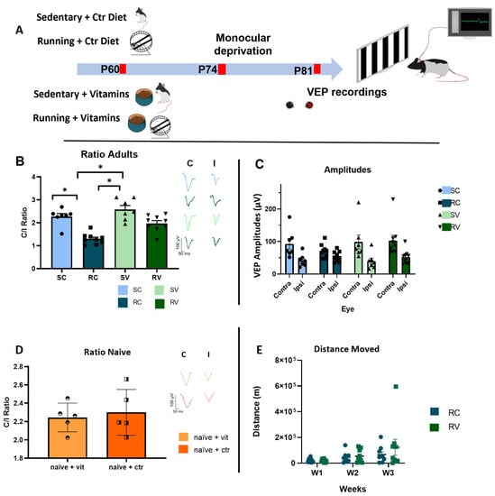 While information concerning the role of myokines in mediating the systemic effects of physical activity is increasing [], the role of redox balance in cerebral plasticity remains mostly unanswered. A high metabolic demand during the critical period was reported to affect the maturation of fast-spiking interneurons in mice, inducing a significant loss of extracellular matrix perineuronal nets []. On the other hand, the activity of the NADPH oxidase complex, responsible for the production of ROS, is known to be crucial for the induction of long-term synaptic plasticity in the hippocampus and in the primary visual cortex of the mouse [,]. Despite this evidence, a direct link between mitohormesis and visual cortex plasticity is missing. Here, we focused on the paradigmatic model of OD plasticity in response to visual deprivation in one eye and evaluated, for the first time, whether modulation of oxidative stress obtained through a dietary intervention with antioxidants interferes with the plasticizing effects of physical exercise on the visual cortex of adult rats. To prevent mitohormesis, we used a diet supplementation with vitamins C and E, two antioxidants widely employed in both human and animal model research [,,,].