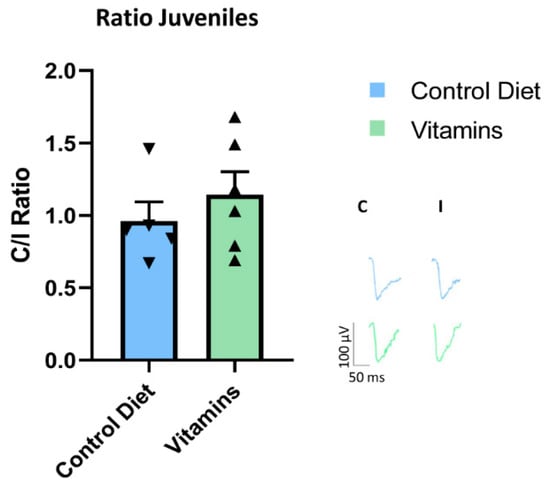 Strikingly, vitamin supplementation markedly reduced the plasticizing effects of physical exercise in adult rats, with treated animals (n = 9) displaying a significantly blockade of the OD shift elicited by MD, in comparison with RC rats (n = 9) (RV, C/I VEP ratio = 1.97 ± 0.12, Figure 1B; C = 102.23 ± 17.01 µV; I = 51.72 ± 7.29 µV, Figure 1C vs. RC; two-way ANOVA, F = 38.63, Holm–Sidak method, p < 0.001). Vitamins E and C did not per se affect OD plasticity in sedentary animals subjected to MD (SV, C/I VEP ratio = 2.58 ± 0.17, Figure 1B; C = 98.41 ± 21.43 µV, I = 39.56 ± 9.36 µV, Figure 1C, n = 7, SV vs. SC two-way ANOVA, F = 25.65, Holm–Sidak method, p = 0.115). Moreover, treatment with Vitamin E and C did not affect the C/I VEP ratio in naïve + vit rats, in which the C/I VEP ratio did not differ from naïve + ctrl animals treated with the control diet (naïve + vit, C/I VEP ratio = 2.24 ± 0.07; naïve + control diet, C/I Vep Ratio 2.30 ± 0.11; two-way ANOVA, F = 25.65, Holm–Sidak method, p = 0.792, Figure 1D).