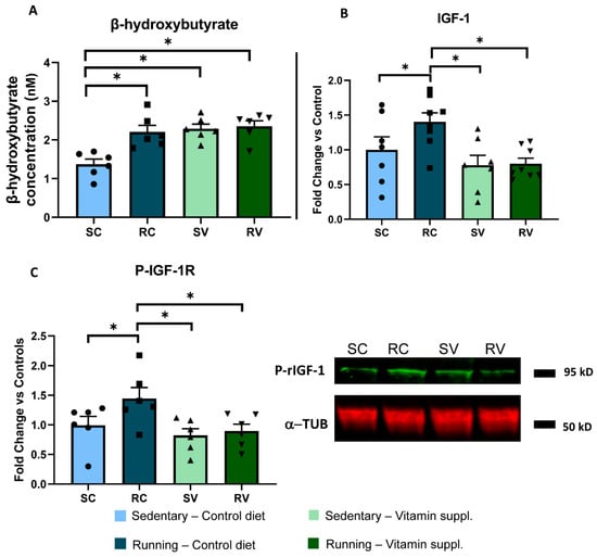 Vitamin supplementation blocks IGF1 increase in running animals. (A) Colorimetric assay for serum β-hydroxybutyrate. Running induced an increase in circulating β-hydroxybutyrate with respect to the sedentary condition (RC, n = 6; 2.20 ± 0.17 nM; vs. SC, n = 6; 1.37 ± 0.13 nM; two-way ANOVA, F = 7.17, Holm–Sidak method, p < 0.001). Vitamin supplementation caused an increase of β-hydroxybutyrate levels in sedentary animals (SV, n = 6; 2.29 ± 0.12 nM; p < 0.001), but no further increase was observed after free running. (B) ELISA for serum IGF-1. Serum IGF-1 levels were markedly increased in exercised rats as compared to sedentary animals fed with the control diet (n = 8 and n = 7, respectively; two-way ANOVA, F = 1.92, Holm–Sidak method, p = 0.047). Vitamin supplementation completely abolished the IGF-1 increase induced by physical exercise, without any effect in sedentary animals (n = 8 and n = 7, p = 0.003 and p = 0.006, respectively). (C) Western blot for pIGF-1 receptor in the visual cortex. Physical activity led to a marked increase of phosphorylated rIG1-1 in the visual cortex of RC (n = 6) vs. SC (n = 6) animals; vitamin supplementation completely blocked this increase, with RV rats (n = 6) displaying levels of phosphorylated IGF-1 significantly lower than those displayed by RC rats (two-way ANOVA, F = 1.74, Holm–Sidak method, p = 0.037, p = 0.013, respectively). No effect was found in the visual cortex of sedentary animals fed with the diet supplemented with antioxidants (n = 6) (SC vs. SV, p = 0.407). The right panel shows representative bands for all groups. To calculate the fold change for both (B,C) panels, each individual value was normalized, dividing it by the mean value of the SC control group. * indicates statistically significant differences; error bars represent SEM.