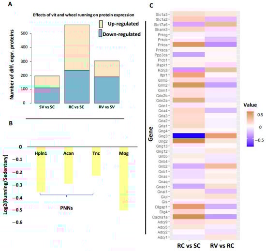 Down-regulated differentially expressed proteins (DEPs) in RC vs. SC rats included plasticity-related proteins with negative action on plasticity, such as Tnc, Acan, and Hapln1, which are components of the perineuronal nets [], key structures enwrapping synapses on GABAergic cells that exerts a negative control on plasticity, and myelin oligodendrocyte protein (Mog), which likewise exerts a negative regulation of synaptic plasticity [] (Figure 4B). On the other hand, proteins belonging to the pathway “glutamatergic synapse” (KEGG rno04724) were up-regulated in the RC vs. SC and RV vs. RC conditions, in line with many results indicating that physical activity promotes synaptogenesis. Strikingly, the up-regulation of this pathway in the RC condition was strongly reduced in the RV condition [,,] (Figure 4C).