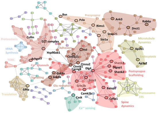 The postsynaptic module is directly connected, via CamK2b, to a module that has, as hub, the CASK kinase, known to interact with CamKII to regulate neuronal growth and plasticity []. While this module specifically identifies the postsynaptic component of glutamatergic synapses, we did not find any increase in postsynaptic GABAergic synapses, indicating an imbalance between excitation and inhibition.