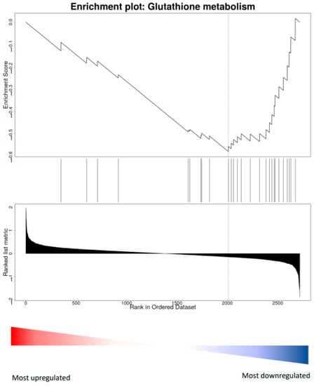Example of relevant gene set enrichment analysis. Wheel-running vs. sedentary. Illustrations were generated in WEBGESTALT, all measured proteins were ranked based on fold change. The position in the ranked list of proteins belonging to rno00480 glutathione metabolism is shown as a vertical line. The plot of the enrichment score illustrates the enrichment of these proteins on the right (down-regulated) side of the list.