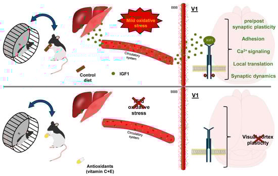 In view of these findings, we propose a model in which physical activity stimulates mitochondrial oxidative metabolism in skeletal muscles, and, in parallel, leads to IGF-1 release from the muscles themselves [] and/or from the liver [] (Figure 7). Circulating IGF-1 enters the brain through the blood brain barrier [], activating its specific receptors in the visual cortex and leading to stimulation of intracellular pathways involved in visual cortex plasticity [,,,]. This may reopen susceptibility to the effects of MD beyond the closure of the CP. Supplementation with high doses of the antioxidants vitamins E and C limits IGF-1 release [] in running subjects, an effect possibly due to a decreased activity of the COX-2 enzyme []. The resulting decrease of circulating IGF-1 may eventually dampen the plasticizing effects set in motion by physical exercise (Figure 7).