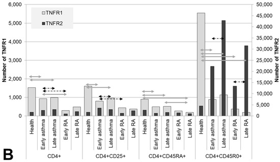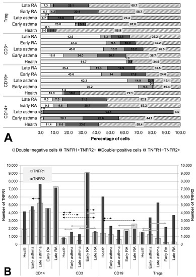 Co-expression (A) and density (B) of TNF receptors of types 1 and 2 in major subsets of immunocompetent cells. Arrows indicate significant (p < 0.05, Kruskal–Wallis test for multiple comparisons) differences in the expression level of TNFR1 between healthy individuals and RA patients or asthma and between patients at the same stage of the disease (between early RA and early asthma and between late RA and late asthma). Light grey arrows indicate differences for TNFR1, dark grey arrows indicate differences for TNFR2.