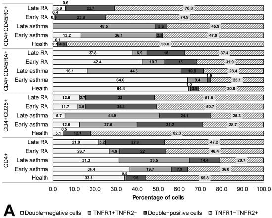 The co-expression of the TNF receptors was assayed both in RA patients or asthma patients subdivided into groups according to disease duration and in healthy individuals on cells of T-helper subpopulations: CD4+, CD4+CD25+, CD4+CD45RA+, and CD4+CD45R0+ cells (Figure 2).
