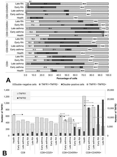 We examined the TNF receptor co-expression on cells of cytotoxic subpopulations (CD8+, CD8+CD25+, CD8+CD45RA+, and CD8+CD45R0+) in both RA and asthma patients subdivided by disease duration and in healthy individuals (Figure 3).