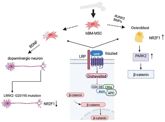Bone morphogenetic proteins (BMPs) and the master gene of the osteoblastic commitment, RUNX2, play an important role in osteogenic differentiation. Further, the secretion of neuronal growth factors promotes neuronal commitment. Wnt/β-catenin signaling is a common pathway of these two different lines. In particular, for osteoblastic commitment, an increase in Park2 stimulates the activation of β-catenin. The expression of NR2F1 is downregulated in the DA neuron of PD patients carrying the LRRK2-G2019S mutation.