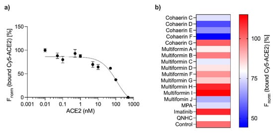 The development of a microarray-based binding assay for ACE2 and spike protein. (a) Displacement of Cy5-ACE2 by unlabeled ACE2 from spike protein. Normalized fluorescent intensity (Fnorm (bound Cy5-ACE2) [%]) as displacement data fitted by a dose-response curve and EC50 of 115 nM. (b) Heat map showing binding inhibition of ACE2 and spike protein by substances 1–17 Binding of Cy5-ACE2 to spotted spike protein in the presence of 40 µM of the compounds. The fluorescence intensity is given in percentage compared to Cy5-ACE2 binding in control without substance.