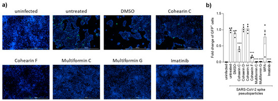 Antiviral activity of selected substances in cell-based infection assay. (a) Representative images of Calu-3 cells infected with SARS-CoV-2 spike pseudoparticle in the absence or presence of cohaerin C, cohaerin F, multiformin C, multiformin G and imatinib treatment. DMSO is used as a treatment control. Scale bar 1000 µm. (b) The quantification of GFP-positive cells (represented in fold change with respect to untreated Calu-3 cells infected with the SARS-CoV-2 spike pseudoparticle). Infection in Calu-3 cells is significantly reduced in the presence of cohaerin C, cohaerin F, multiformin C, multiformin G and imatinib (n = 3–4 wells per group). ∗∗∗ p < 0.001; one-way ANOVA, Tukey multiple-comparisons test.