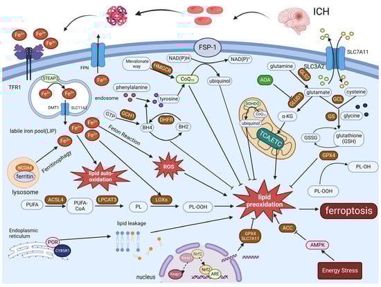 The heme that enters the cell by the above pathway is broken down by heme oxygenase–1 (HO–1) into iron, carbon monoxide (CO), and biliverdin, and the iron is transported extracellularly by the iron export protein FPN in microglia, causing a large amount of toxic iron to enter the brain parenchyma [22]. Extracellular iron binds to transferrin on neurons and enters the neurons, causing neuronal death. Two-molecule Fe3+ participates in the transport of iron by binding to one molecule of transferrin, which transports Fe3+ to the intracellular by binding to the membrane protein transferrin receptor 1 (TFR1) on the surface of neurons to form a Tf–Fe3+–TFR1 complex. Fe3+ is then reduced to Fe2+ by the Six-Transmembrane Epithelial Antigen of Prostate 3 (STEAP3). Endosomes release Fe2+ into the cytoplasmic labile iron pool (LIP), which requires DMT1/Solute Carrier Family 11 Member 2 (SLC11A2) regulation [23,24,25] (Figure 1). Fe2+ in the LIP can participate in the synthesis of the lipid peroxidation key enzyme lipoxygenases (LOXs), resulting in ferroptosis. In addition, Fe2+ will also participate in the Fenton reaction with hydrogen peroxide to produce hydroxyl radicals, attacking cellular components and causing ferroptosis. Fe2+ can also induce lipid auto-oxidation by producing reactive oxygen species (ROS) by iron-catalyzed enzymes, thereby promoting ferroptosis [23]. Ferritinophagy is also mediated by nuclear receptor coactivator 4 (NCOA4), which binds to ferritin and then transports iron-bound ferritin to the autophagosome for lysosomal degradation and iron release. NCOA4 knockdown can prevent lipid peroxidation and ferroptosis by reducing the amount of iron in the intracellular LIP [26]. Further to that, existing research indicates that the FPN is the only protein that transports iron out of cells, lowering the concentration of Fe2+ in cells and, thereby, inhibiting ferroptosis. In summary, iron plays an important role in the mechanism of ferroptosis after ICH, and future research into iron metabolism pathways may provide a new therapeutic avenue for alleviating brain injury after ICH.