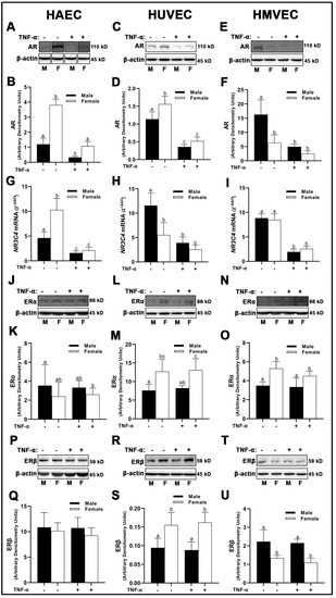 Expression of sex receptors in male and female endothelial cells. HAECs, HUVECs and HMVECs were cultured in starvation medium at ~80% confluency for 24 h with or without TNF-α (20 ng/mL). Protein expression of AR (A–F), ERα (J–O), and ERβ (P–U) were determined by Western blot. Quantification was performed using Image Lab (Bio-Rad Laboratories, Inc.). Protein was normalized to respective control bands (β-actin). Gene expression of AR (G–I) were determined with qPCR. Genes of interest were normalized to housekeeping gene cyclophilin. Data are expressed as mean ± SD from 3–6 experiments. Data were statistically analyzed with one-way ANOVA followed by Tukey post hoc multiple comparison analysis between groups. Values that do not share the same letter are significantly different from each other (p ≤ 0.05).