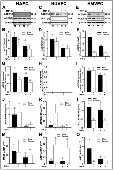 Expression of protective RAS components in male and female endothelial cells. HAECs, HUVECs and HMVECs were cultured in starvation medium at ~80% confluency for 24 h with or without TNF-α (20 ng/mL). Protein expression of ACE2 (A–I) were determined by Western blot. Quantification was performed using Image Lab (Bio-Rad Laboratories, Inc.). Protein was normalized to respective control bands (β-actin or GAPDH). Gene expression of AT2R (J–L) and Mas receptor (M–O) were determined with qPCR. Genes of interest were normalized to housekeeping gene cyclophilin. Data are expressed as mean ± SD from 4–6 experiments. Data were statistically analyzed with one-way ANOVA followed by Tukey post hoc multiple comparison analysis between groups. Values that do not share the same letter are significantly different from each other (p ≤ 0.05).