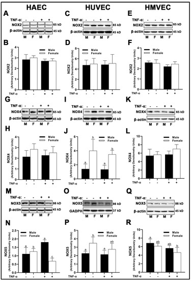 Expression of pro-oxidant NOX isoforms in male and female endothelial cells. HAECs, HUVECs and HMVECs were cultured in starvation medium at ~80% confluency for 24 h with or without TNF-α (20 ng/mL). Protein expression of NOX2 (A–F), NOX4 (G–L) and NOX5 (M–R) were determined by Western blot. Quantification was performed using Image Lab (Bio-Rad Laboratories, Inc.). Protein was normalized to respective control bands (β-actin or GAPDH). Data are expressed as mean ± SD from 4–6 experiments. Data were statistically analyzed with one-way ANOVA followed by Tukey post hoc multiple comparison analysis between groups. Values that do not share the same letter are significantly different from each other (p ≤ 0.05).