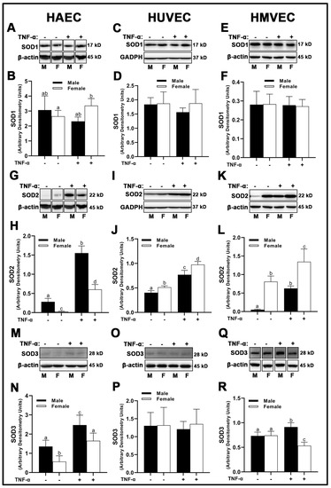 Expression of SOD isoforms in male and female endothelial cells. HAECs, HUVECs and HMVECs were cultured in starvation medium at ~80% confluency for 24 h with or without TNF-α (20 ng/mL). Protein expression of SOD1 (A–F), SOD2 (G–L) and SOD3 (M–R) were determined by Western blot. Quantification was performed using Image Lab (Bio-Rad Laboratories, Inc.). Protein was normalized to respective control bands (β-actin or GAPDH). Data are expressed as mean ± SD from 4–6 experiments. Data were statistically analyzed with one-way ANOVA followed by Tukey post hoc multiple comparison analysis between groups. Values that do not share the same letter are significantly different from each other (p ≤ 0.05).