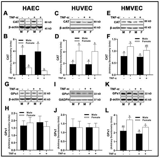 Expression of peroxidases in male and female endothelial cells. HAECs, HUVECs and HMVECs were cultured in starvation medium at ~80% confluency for 24 h with or without TNF-α (20 ng/mL). Protein expression of CAT (A–F) and GPx1 (G–L) were determined by Western blot. Quantification was performed using Image Lab (Bio-Rad Laboratories, Inc.). Protein was normalized to respective control bands (β-actin or GAPDH). Data are expressed as mean ± SD from 4–6 experiments. Data were statistically analyzed with one-way ANOVA followed by Tukey post hoc multiple comparison analysis between groups. Values that do not share the same letter are significantly different from each other (p ≤ 0.05).