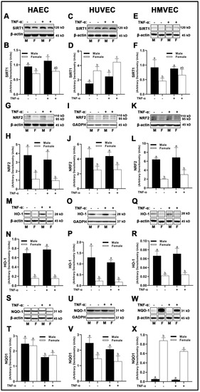 Total nuclear factor erythroid 2–related factor (NRF)2 and heme oxygenase (HO)-1 protein expression was higher in male-derived cells compared with female-derived cells across all endothelial cells evaluated with no effects of inflammatory insult (Figure 7G–R), suggesting increased antioxidant response element (ARE) activity in males. However, NADPH quinone dehydrogenase (NQO1) expressed uniquely in HAECs, HUVECs, and HMVECs. In HAECs, we observed no sex differences in NQO1 expression (Figure 7S,T), while TNF-α significantly reduced NQO1 in both sexes. In contrast, clear sex differences were noted in HUVECs and HMVECs. Male-derived HUVECs expressed higher NQO1 compared to female HUVECs (Figure 7U,V), while TNF-α treatment did not significantly reduce NQO1 expression between sexes. In HMVECs, inverse expression of NQO1 between sexes was observed with a larger magnitude of difference, as NQO1 was very weakly expressed in males compared to females (~17-fold difference) (Figure 7W,X). TNF-α reduced NQO1 in female HMVECs, but not in male HMVECs. In brief, our data indicate that NRF2 and HO-1 are uniquely increased in male-derived cells irrespective of cell origin and are not influenced by inflammatory stimulation with TNF-α. However, SIRT1 and NQO1 were distinctly expressed between sexes among differing all three human primary endothelial cells studied.