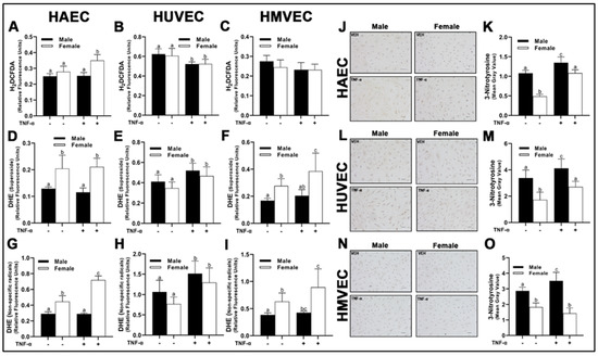 Redox activity in male and female endothelial cells. HAECs, HUVECs and HMVECs were cultured at ~80% confluency for 24 h in starvation medium with or without TNF-α (20 ng/mL). H2DCFDA or DHE dissolved in dimethyl sulfoxide were added to wells (10 µM final concentration) followed by 30 min incubation (37 °C and 5% CO2). Phenol red-free starvation medium supplemented with NucBlue™ (1 drop/mL) was added. Fluorescence was read at the following Ex/Em: 495/527 (A–C; H2DCFDA), 518/606 (D–F; DHE; O2−) 480/576 (G–I; DHE; non-specific radicals) and 360/460 (Hoechst 33342 with NucBlue™). Fluorometric values for H2DCFDA and DHE were normalized to Hoechst 33342. Cells were also fixed on poly-L-lysine cover slips and stained with DAB diluent following incubation with nitrotyrosine primary antibody (J–O). Quantification was performed with Image J. The scale bar is 50 µm and objective magnification is 20×. Data are expressed as mean ± SD from 3–6 experiments. Data were statistically analyzed with one-way ANOVA followed by Tukey post hoc multiple comparison analysis between groups. Values that do not share the same letter are significantly different from each other (p ≤ 0.05).