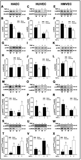 In both male-derived HAECs and HMVECs, eNOS protein expression was significantly greater compared to female-derived cells (Figure 9A,B,E,F). In HUVECs, inverse sex differences were observed, as female-derived cells expressed significantly greater eNOS than male-derived cells (Figure 9C,D). We did not observe any sex or treatment differences in Akt phosphorylation in HAECs (Figure 9G,H). However, male-derived HUVECs had greater Akt phosphorylation compared with female-derived cells (Figure 9I,J), while the inverse was true in HMVECs (Figure 9K,L). Further, we observed that TNF-α treatment in HMVECs significantly reduced Akt phosphorylation in male-derived cells compared with basal conditions, but this effect did not occur in female-derived cells. With respect to phosphorylation of eNOS at Ser1177, we observed a complete lack of uniformity between sexes and cell types. In HAECs, Ser1177 phosphorylation increased significantly in female-derived cells treated with TNF-α compared with basal cells of both sexes and TNF-α-treated males, with no other differences between groups detected (Figure 9M,N). In HUVECs, male-derived cells expressed greater Ser1177 phosphorylation of eNOS compared with female-derived cells, with no significant TNF-α effects (Figure 9O,P). In contrast, male-derived HMVECs expressed greater phosphorylation of Ser1177 in basal male-derived cells compared with all other groups with no other significant differences detected (Figure 9Q,R). In both HAECs and HMVECs, phosphorylation of eNOS at Thr495 was significantly lower in male-derived compared with female-derived cells (Figure 9S,T,W,X), while the inverse was observed in HUVECs (Figure 9U,V).