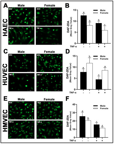 Nitric oxide bioavailability in male and female endothelial cells. HAECs, HUVECs and HMVECs were cultured in starvation medium at ~80% confluency for 24 h with or without TNF-α (20 ng/mL). DAF-2DA was detected by fluorescence microscopy (A,C,E) at 485/528 (Ex/Em). Fluorescent intensity of cells was quantified with Image J (B,D,F). Data are expressed as mean ± SD from 4–6 experiments. Data were statistically analyzed with one-way ANOVA followed by Tukey post hoc multiple comparison analysis between groups. Values that do not share the same letter are significantly different from each other (p ≤ 0.05).