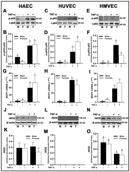 Expression of inflammatory markers in male and female endothelial cells. HAECs, HUVECs and HMVECs were cultured in starvation medium at ~80% confluency for 24 h with or without TNF-α (20 ng/mL). Protein expression of phospho-p65 (A–F) and iNOS (J–O) were determined by Western blot. Quantification was performed using Image Lab (Bio-Rad Laboratories, Inc.). Protein was normalized to respective control bands (β-actin). Phosphorylated proteins were normalized to respective total proteins. Gene expression of MCP-1 (G–I) were determined with qPCR. Genes of interest were normalized to housekeeping gene cyclophilin. Data are expressed as mean ± SD from 4–6 experiments. Data were statistically analyzed with one-way ANOVA followed by Tukey post hoc multiple comparison analysis between groups. Values that do not share the same letter are significantly different from each other (p ≤ 0.05).