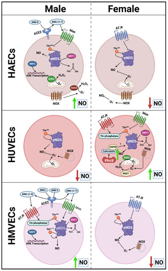 Proposed schematic presentation of sex-specific differences in protein expression between endothelial cells that may mediate sex- and cell-specific discrepancies in NO bioavailability.