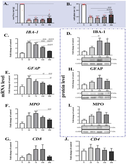 Time-dependent changes in mechanical and thermal hypersensitivity in male mice; (A) von Frey test; (B) cold plate test and associated changes in IBA-1, GFAP, MPO, CD8 and CD4 mRNA ((C,E,F,G,J), respectively) and protein IBA-1, GFAP, MPO ((D,H,I), respectively) levels in the spinal cord on the 2nd, 7th, 12th, 14th and 28th days after chronic constriction injury of the sciatic nerve. The behavioral data are presented as the means ± SEMs. The red dots indicate individual measurements. The horizontal dotted line shows the cut off value. The RT–qPCR or Western blot data are presented as the fold change of control ± SEMs. Intergroup differences were analyzed using one-way ANOVA with Bonferroni’s post hoc test for multiple comparisons. * p < 0.05, ** p < 0.01, and *** p < 0.001 indicate a significant difference compared with the control group (naive). @ p < 0.05, @@ p < 0.01, and @@@ p < 0.001 indicate differences between the 2nd vs. 7th, 2nd vs. 12th, 2nd vs. 14th, 2nd vs. 28th, 7th vs. 14th, 7th vs. 28th, 12th vs. 28th, and 14th vs. 28th days. The quantity of animals used in the experiment was as follows: Behavioral tests: N (n = 10), 2 d (n = 10), 7 d (n = 10), 14 d (n = 10), 28 d (n = 10); RT-qPCR: N (n = 4–6), 2 d (n = 8), 7 d (n = 8–9), 14 d (n = 10), 28 d (n =9); Western blot: N (n = 5–6), 2 d (n = 5–6), 12 d (n = 6), 28 d (n = 5). Abbreviations: N—naive.