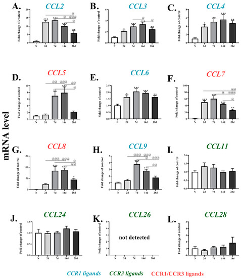 Time-dependent changes in CCL2, CCL3, CCL4, CCL5, CCL6, CCL7, CCL8, CCL9, CCL11, CCL24, CCL26 and CCL28 mRNA levels (A–L) in male mice on the 2nd, 7th, 14th and 28th days after chronic constriction injury of the sciatic nerve in the spinal cord. The RT–qPCR data are presented as the fold change of control ± SEMs. Intergroup differences were analyzed using one-way ANOVA with Bonferroni’s post hoc test for multiple comparisons. * p < 0.05, ** p < 0.01, and *** p < 0.001 indicate a significant difference compared with the control group (naive). @ p < 0.05, @@ p < 0.01, and @@@ p < 0.001 indicate differences between the 2nd vs. 7th, 2nd vs. 14th, 2nd vs. 28th, 7th vs. 14th, 7th vs. 28th, and 14th vs. 28th days. The quantity of animals used in the experiment was as follows: RT-qPCR: N (n = 5–7), 2d (n = 8), 7d (n = 8–10), 14d (n = 10), 28d (n = 8–9). Abbreviations: N—naive.