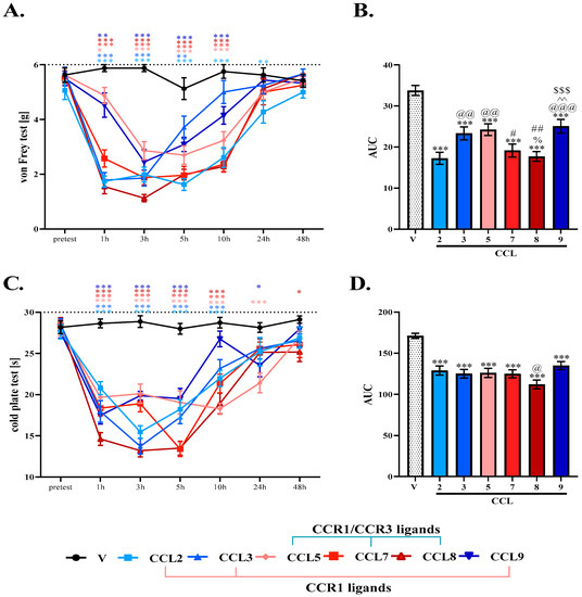 Painful reactions were observed after 1 h and lasted until 5 h for all examined chemokines in both tests. Moreover, in the von Frey test, the CCL2 effect was observed until 24 h postinjection. In the case of cold plates, CCL5 and CCL9 maintained their effect until 24 h after injection. A slight pronociceptive effect was observed in the same test for CCL8 48 h post administration. The strongest pain-related reaction in the von Frey and cold plate tests was observed for CCL8 3 h after injection (F = 29.04, p < 0.0001; F = 38.24, p < 0.0001; Figure 4A,C, respectively). However, analysis of the area under the curve revealed that CCL2 was the most pronociceptive chemokine, taking into consideration all time points, in the case of mechanical hypersensitivity (F = 15.37, p < 0.0001; Figure 4B), while in the case of thermal hypersensitivity (F = 13.72, p < 0.0001; Figure 4D), the most pain-evoking chemokine was CCL8. Moreover, two-way ANOVA confirmed a significant interaction between the treatment and the analyzed time points in the von Frey test (F = 8.74; p < 0.0001) and cold plate test (F = 6.57; p < 0.0001). Post hoc comparisons for this analysis are available in Supplementary S1.