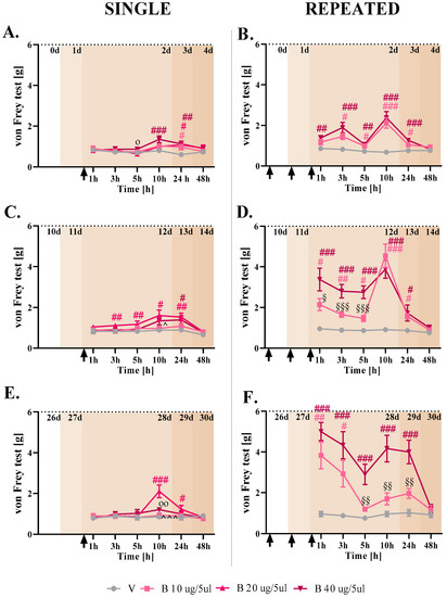 Effect of a single (10, 20 and 40 μg/5 μL; (A,C,E)) and repeated (10 and 40 μg/5 μL; (B,D,F)) i.t. administration of bindarit on mechanical hypersensitivity in male mice as measured on the 2nd, 12th, and 28th days after chronic constriction injury of the sciatic nerve. Measurements were performed 1, 3, 5, 10, 24 and 48 h after a single drug administration or after three doses of the given substance. The horizontal dotted line shows the cutoff value. The data are presented as the means ± SEMs. Intergroup differences were analyzed using one-way ANOVA with Bonferroni’s post hoc test for multiple comparisons. # p < 0.05, ## p < 0.01, and ### p < 0.001 indicate a significant difference compared with the vehicle-treated group. ^ p < 0.05 and ^^^ p < 0.001 indicate a significant difference between B 10 and 20 μg/5 μL; § p < 0.05, §§ p < 0.01 and §§§ p < 0.001 indicate a significant difference between B 10 and 40 μg/5 μL; ᴏ p < 0.05 and ᴏᴏ p < 0.01 indicate a significant difference between B 20 and 40 μg/5 μL. The quantity of animals used in the experiment was as follows: Single injection: (2nd day: V (n = 6), B10 (n = 6), B20 (n = 6), B40 (n = 6); 12th day: V (n = 7), B10 (n = 7), B20 (n = 7), B40 (n = 7); 28th day: V (n = 7), B10 (n = 6), B20 (n = 6), B40 (n = 7)); Repeated injection: (2nd day: V (n = 10), B10 (n = 10), B40 (n = 10); 12th day: V (n = 8–9), B10 (n = 8), B40 (n = 7); 28th day: V (n = 5), B10 (n = 6), B40 (n = 6)). Abbreviations: B—Bindarit, ↑—injection.