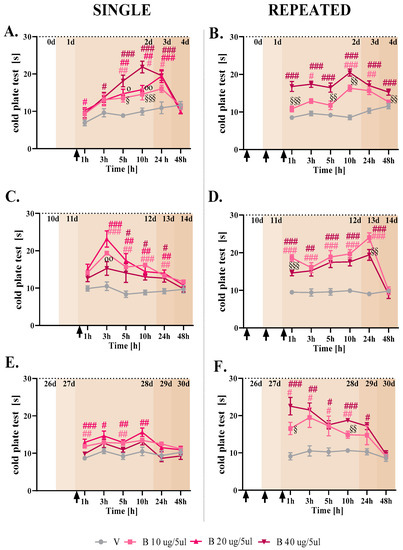 Effect of a single (10, 20 and 40 μg/5 μL; (A,C,E)) and repeated (10 and 40 μg/5 μL; (B,D,F)) i.t. administration of bindarit on thermal hypersensitivity in male mice as measured on the 2nd, 12th and 28th days after chronic constriction injury of the sciatic nerve. Measurements were performed 1, 3, 5, 10, 24 and 48 h after a single drug administration or after three doses of the given substance. The horizontal dotted line shows the cutoff value. The data are presented as the means ± SEMs. Intergroup differences were analyzed using one-way ANOVA with Bonferroni’s post hoc test for multiple comparisons. # p < 0.05, ## p < 0.01, and ### p < 0.001 indicate a significant difference compared with the vehicle-treated group. § p < 0.05, §§ p < 0.01 and §§§ p < 0.001 indicate a significant difference between B 10 and 40 μg/5 μL; ᴏ p < 0.05 and ᴏᴏ p < 0.01 indicate a significant difference between B 20 and 40 μg/5 μL. The quantity of animals used in the experiment was as follows: Single injection: (2nd day: V (n = 6), B10 (n = 6), B20 (n = 5, 6), B40 (n = 6); 12th day: V (n = 7), B10 (n = 7), B20 (n = 7), B40 (n = 6-7); 28th day: V (n = 7), B10 (n = 6), B20 (n = 6), B40 (n = 7)); Repeated injection: (2nd day: V (n = 10), B10 (n = 10), B40 (n = 10); 12th day: V (n = 8–9), B10 (n = 10), B40 (n = 8); 28th day: V (n = 5), B10 (n = 6), B40 (n = 6)). Abbreviations: B—Bindarit, V—vehicle, ↑—injection.