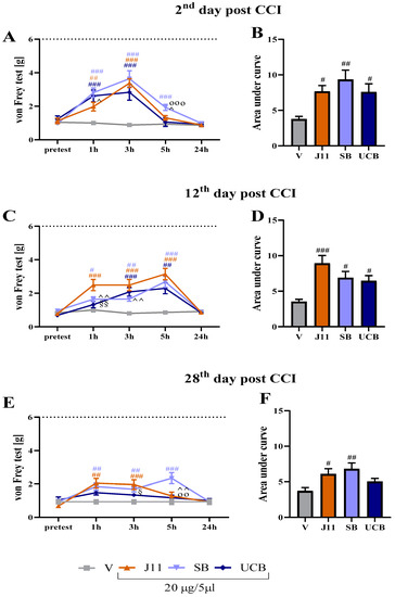 Effect of a single (20 μg/5 μL) i.t. administration of J113863, SB328437 or UCB35625 on mechanical hypersensitivity (A,C,E) in male mice as measured on the 2nd, 12th, and 28th days after chronic constriction injury of the sciatic nerve. Measurements were performed 1, 3, 5 and 24 h after substance injection. The horizontal dotted line shows the cut off value. Moreover, the data obtained were analyzed as areas under the curve (B,D,F). The data are presented as the means ± SEMs (A,C,E) or total area under curve ± SEMs (B,D,F). Intergroup differences were analyzed using one-way ANOVA with Bonferroni’s post hoc test for multiple comparisons. # p < 0.05, ## p < 0.01, and ### p < 0.001 indicate a significant difference compared with the vehicle-treated group. ^ p < 0.05 and ^^ p < 0.001 indicate differences between J11 and SB, § p < 0.05, §§ p < 0.001 indicate a difference between J11 and UCB; ᴏᴏ p < 0.01, ᴏᴏᴏ p < 0.001 indicate a significant difference between SB and UCB. The quantity of animals used in the experiment was as follows: 2nd day: V (n = 10), J11 (n = 7–8), SB (n = 10), UCB (n = 6); 12th day: V (n = 7), J11 (n = 7), SB (n = 10), UCB (n = 5); 28th day: V (n = 6), J11 (n = 5), SB (n = 7), UCB (n = 5). Abbreviations: J11—J113863, SB—SB328437, UCB—UCB35625, V—vehicle.