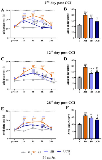As shown in Figure 1, sciatic nerve surgery led to the development of mechanical and thermal hypersensitivity in mice, which was observed between the 2nd and 28th day. On the 2nd day after surgery, J113863, SB328437 and UCB35625 exerted analgesic effects compared to vehicle-treated animals as measured by von Frey (Figure 7A) and cold plate (Figure 8A) tests. However, in the case of mechanical hypersensitivity, the strongest effects were obtained for SB328437 (F = 5.69, p = 0.012, Figure 7B), and the peak of its action was observed 3 h (F = 14.30, p < 0.0001, Figure 7A) after injection, while in the case of thermal hypersensitivity, the highest effectiveness was observed for J11328437 (F = 12.02, p = 0.0006, Figure 8B), with the strongest effect measured 3 h (F= 37.92, p < 0.0001, Figure 8A) after substance delivery. Moreover, on the 12th day post CCI, all the tested substances showed antinociceptive properties according to the von Frey (Figure 7C) and cold plate (Figure 8C) test results.